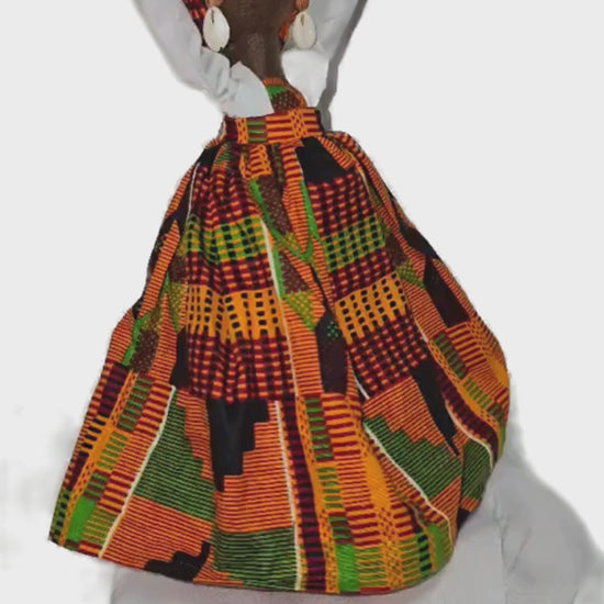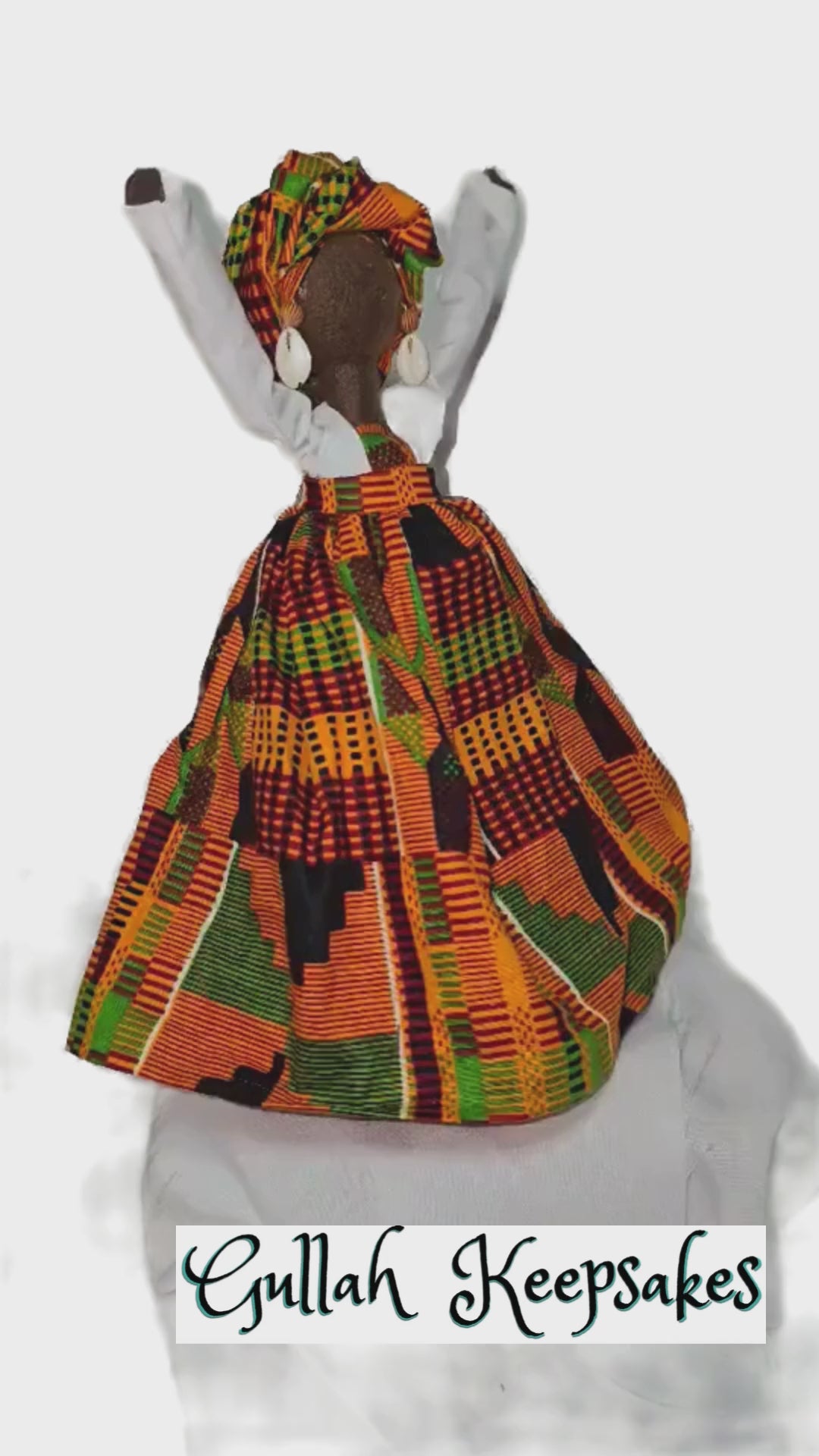 This Gullah Keepsakes handmade in Charleston Gullah Doll features tradition Kente design printed in cotton fabric